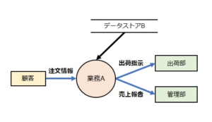 | 問題 | 図のDEDで示された業務Aに関する、次の記述中の[a]に入れる字句として適切なものはどれか。ここで、データストアBの具体的な名称は記載していない。「業務Aでは、出荷の指示を行うとともに[a]などを行う。」