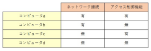 | 問題 | 表はコンピューターa~dのネットワーク接続(インターネットなどのオープンネットワークに接続、又はローカルエリアネットワークに接続)の有無及びアクセス制御機能の有無を示したものである。コンピュータa~dのうち、不正アクセス禁止法における不正アクセス行為の対象になり得るものはどれか。