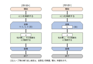 | 問題 | 流れ図Xで示す処理では、変数iの値が、1→3→7→13と変化し、流れ図Yで示す処理では、変数iの値が、1→5→13→25と変化した。図中のa,bに入れる字句の適切な組み合わせはどれか。