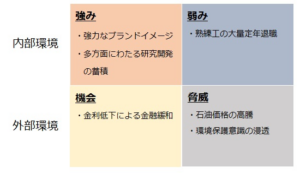 | 問題 | 自動車メーカーA社では、近い将来の戦略を検討するため自社の強みと弱み、そして、外部環境の機会と脅威を整理した。この結果を基に、強みを活用して脅威を克服する対策案として適切なものはどれか。